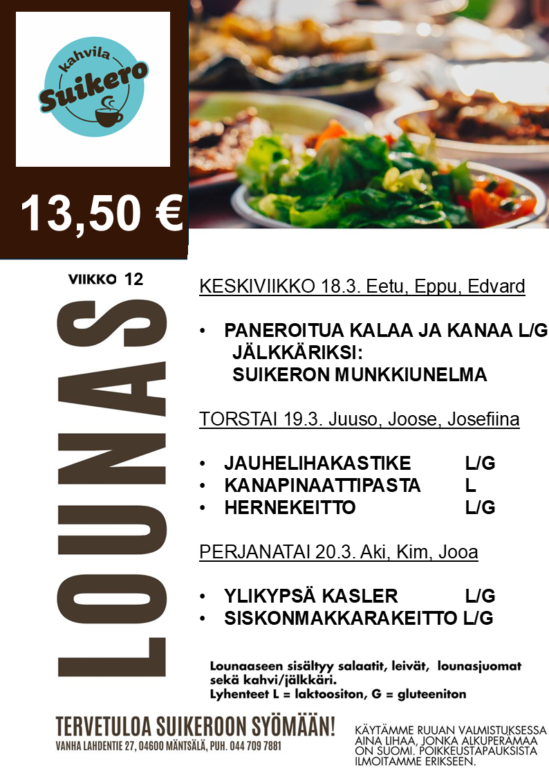 Tsekkaa alta vaihtuva lounaslistamme ja muut Suikeron safkat!